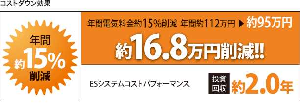 〈力率改善〉ESシステムは、年間削減率が一番高い方法です。年間電気削減率は約15%で、年間電気代が112万円の場合は、導入後の金額が約95万円となり、約16.8万円削減になります。これにより、システム導入費用の回収が約2.7年で、以後はそのままその金額が利益となります。